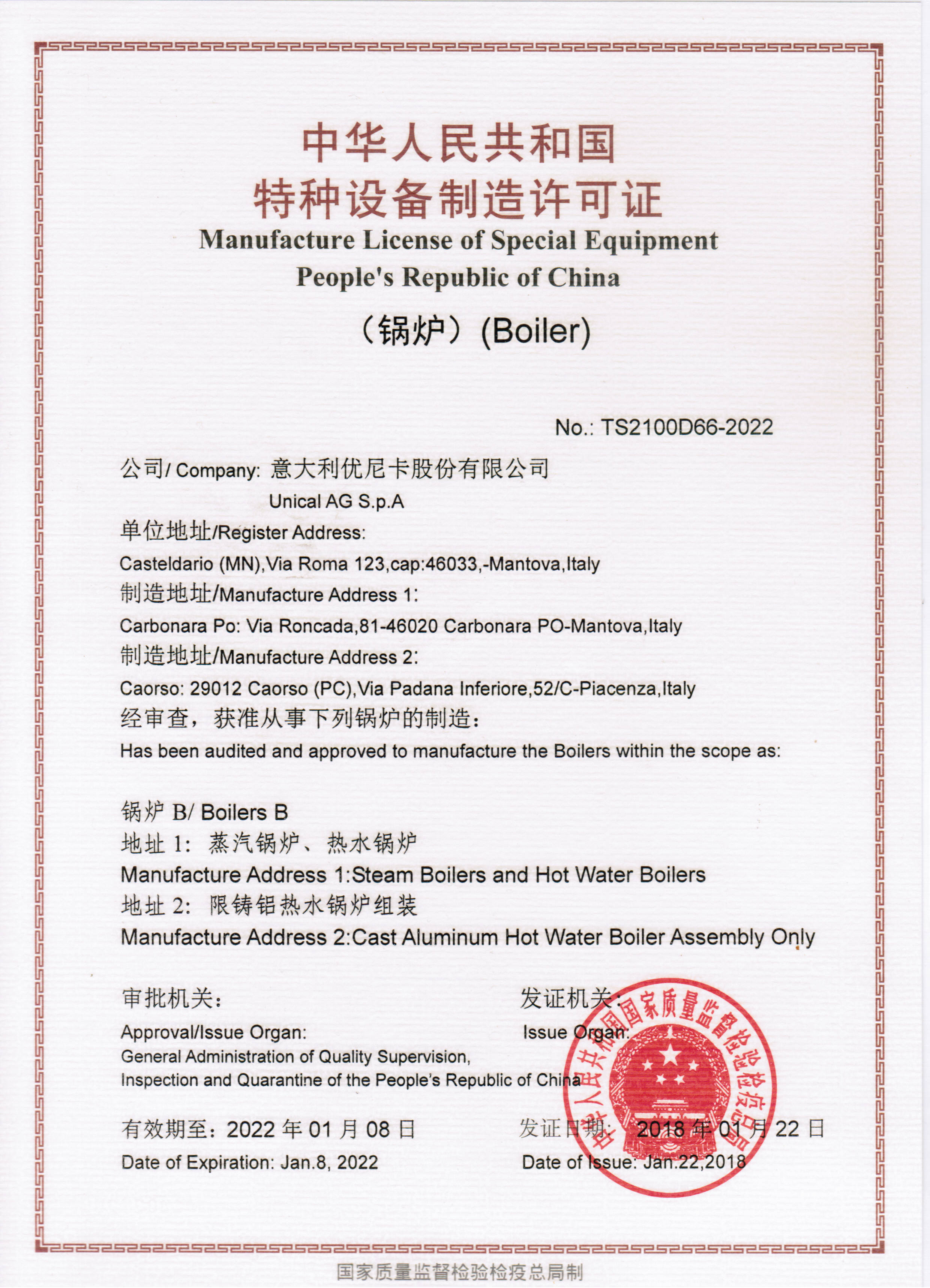 Unical 还通过了各国的准入认证. 比如中国,获得了进口制造许可B级。